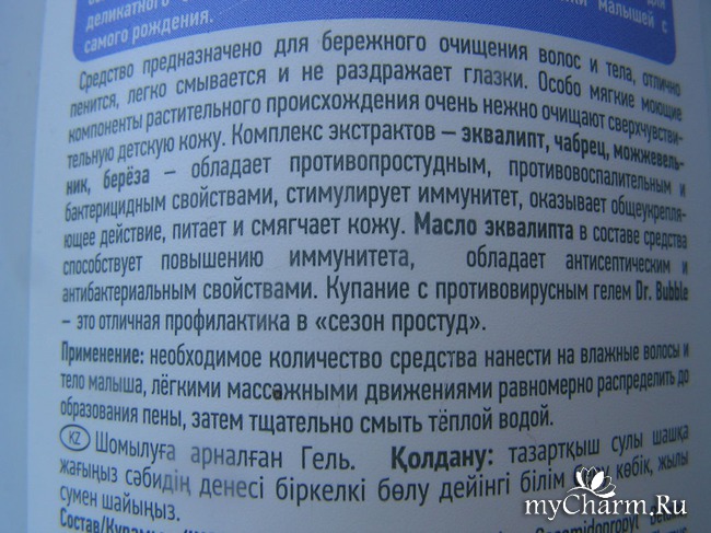 На этикетке с тыльной стороны геля имеется много интересной информации о воздействии геля на кожу и организм ребенка в целом. Целебные растительные экстракты растений подобраны специально для действия на иммунитет малышей по его стимуляции и общеукрепляющему действию, так как обладают противопростудными, противовоспалительными и бактерицидными свойствами. Кроме того, входящее в состав масло эвкалипта повышает иммунитет, к тому же является природным антисептиком, защищающим от бактерий.