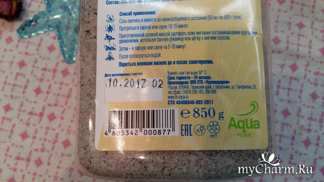 Произведен скраб в Пермском крае, в городе Березники ООО ПТК "Уралмедпром". Изготовлен в октябре 2017 года, срок годности 24 месяца. Хранить при температуре не выше 30 градусов. Баночка на первый взгляд не большая, но довольно увесистая, в ней 850 грамм соли.