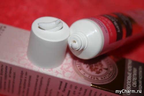 В коробочке оказался не менее шикарный тюбик. Вот что-что, а оформление просто очаровывает. Тюбик также исполнен в розово-коричневых тонах с мелким цветочным узором и гравировкой позолотой. На нем указано полное описание, срок годности и способ применения. Форма утонченная и вытянутая. Мне такие нравятся.