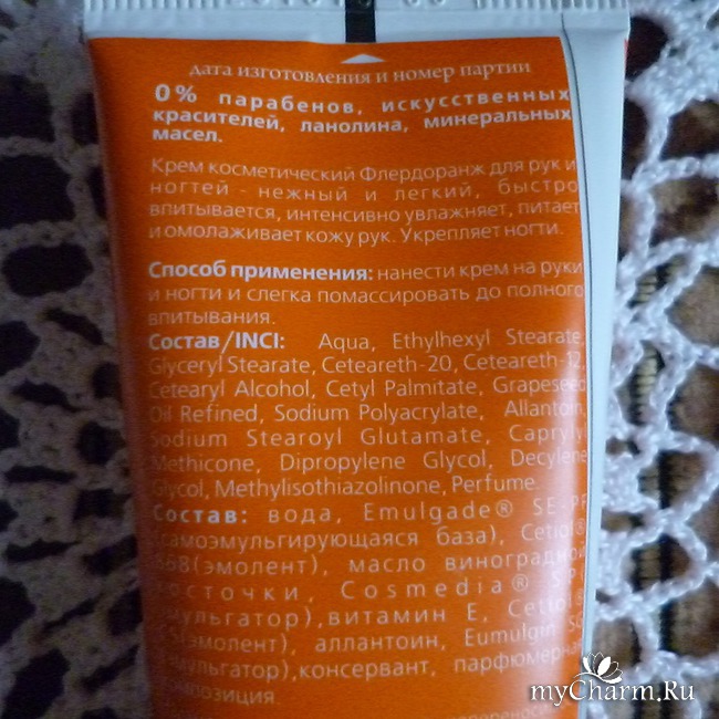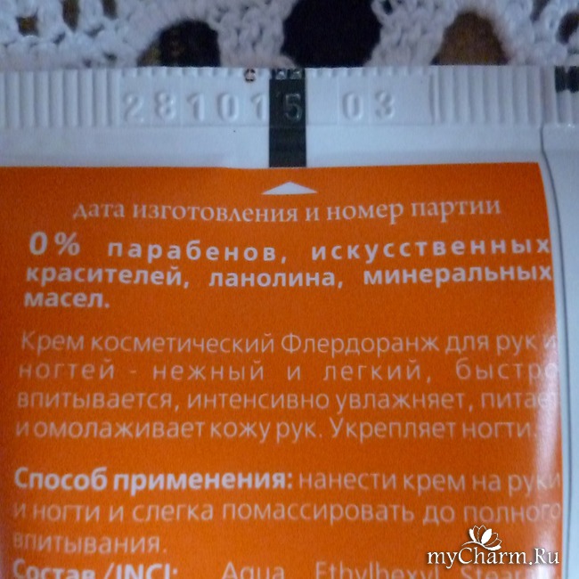 Крем Флердоранж позиционируется производителем как питательный, регенерирующий, омолаживающий «капризную кожу» наших рук, а также способствует укреплению ногтевых пластин.