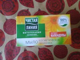 Итак, знакомьтесь, перед Вами косметическое прозрачное мыло с экстрактом календулы «Чистая линия». В последнее время у производителей прямо-таки вошло в моду упаковывать мыло в картонную коробочку. Это действительно привлекает покупателей, так было и с нами. Сама коробочка приятно оформлена, с цветочками календулы на фоне. Слова «Одобрено косметологами» и «100% натуральная растительная основа», несомненно, добавляют еще больше доверия к изготовителю.