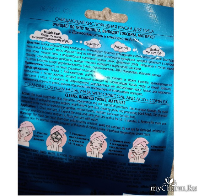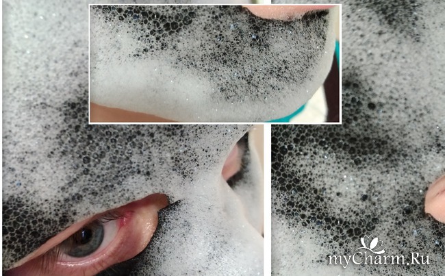 После нанесения маски, она начинает пенится. Надуваясь пузырьки нежно щекочут кожу, делая легкий массаж. Кожа насыщается кислородом, ускоряются процессы ее обновления и регенерации, усиливается клеточное дыхание. Пены становится достаточно много, но она не стекает, а держится на тканевой основе. Уникальный состав продукта впитывается в кожу и вытягивает из пор загрязнения. Ткань маски черного цвета из-за имеющегося в составе древесного угля, который известен своим абсорбирующим свойством. Так же в составе имеются фруктовые кислоты (гликолевая, яблочная и винная), тем самым маска действует на кожу, как пилинг. В связи с этим кожа может покраснеть на время проведения процедуры. Я, к счастью, такого не заметила.