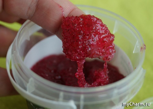 Удобный объем небольшой, всего 180 мг, что позволяет часто менять скрабы и пользоваться разными. Открываем крышечку. Очень ароматная и красивая смесь, крупно-сахарной консистенции, приятного красного цвета. Очень приятный сладкий аромат спелого винограда.