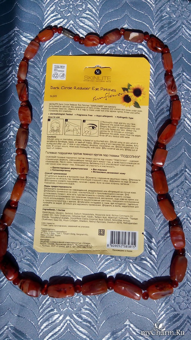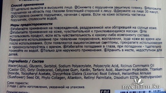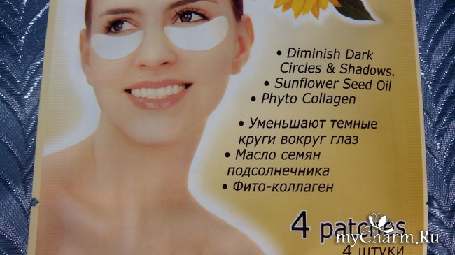 Так же на титульной стороне упаковки сообщалось, что эти гелиевые подушечки уменьшают темные круги под глазами, содержат масло семян подсолнечника и фито-коллаген.