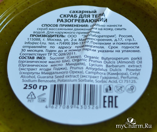 Когда читаем, что в скраб входят такие компоненты как: органические масла – ши, миндаля; экстракты ягод Годжи, гуараны, то настроении улучшается и верится в действенность продукта. Также присутствует камфора, видимо, она призвана «разогревать» тело при использовании скраба. Во многих противопростудных лекарствах добавляется для согревающего эффекта.