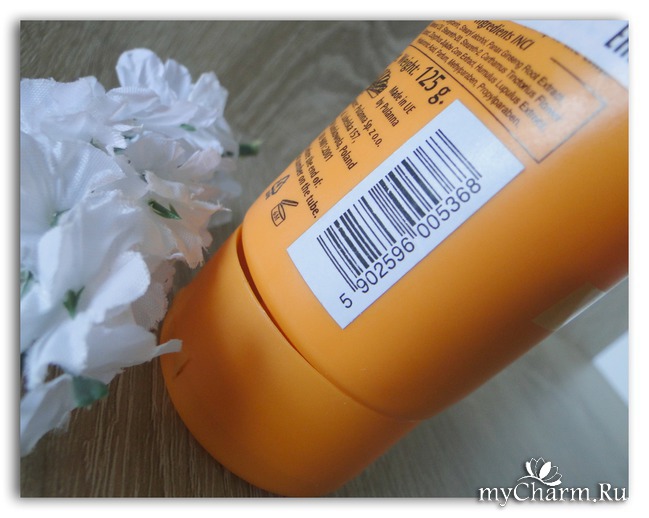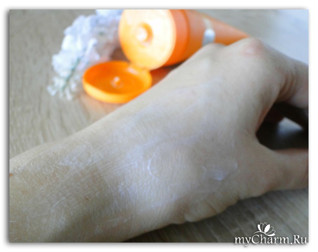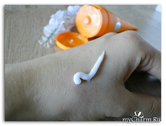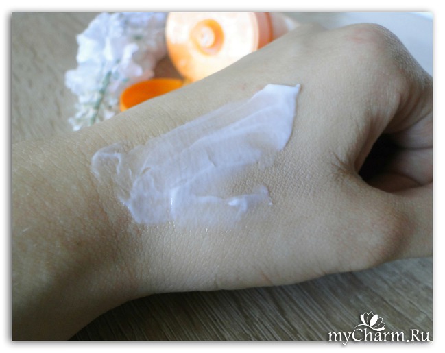 Крем имеет белый цвет, консистенция достаточно плотная, но по коже распределяется легко.