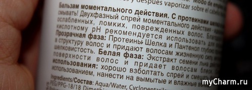 Спрей-бальзам с быстрым эффектом наносится на влажные чистые волосы. Перед применением его следует тщательно встряхнуть, чтобы фазы смешались и образовали однородную жидкость. Распыляем по всей поверхности и сразу же наблюдаем результат. Жесткие непослушные волосы в один момент смягчаются, становятся гладкими, рассыпными и блестящими. Даже если вы вымыли голову и забыли (о, ужас!) нанести бальзам-кондиционер или маску, то данное средство окажется просто спасением. Можно сказать, что это «реаниматор волос в один пшик»! Именно так.