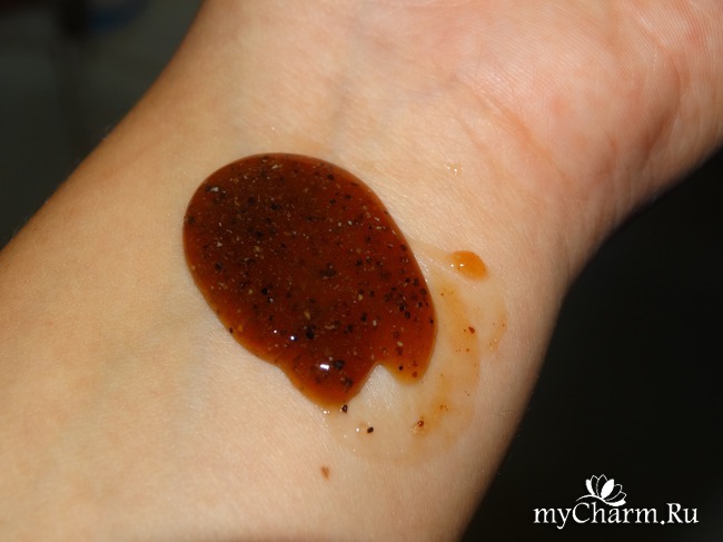 Пилинг тёмно-коричневого цвета, он имеет довольно густую, немного желеобразную консистенцию. Отчетливо заметны скрабирующие частички. Они небольшие.