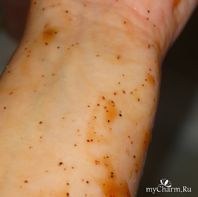 Наносить на тело пилинг довольно приятно, если не считать, что в процессе растирания часть его сгусточками падает с кожи, как излишки. Но это всё мелочи.