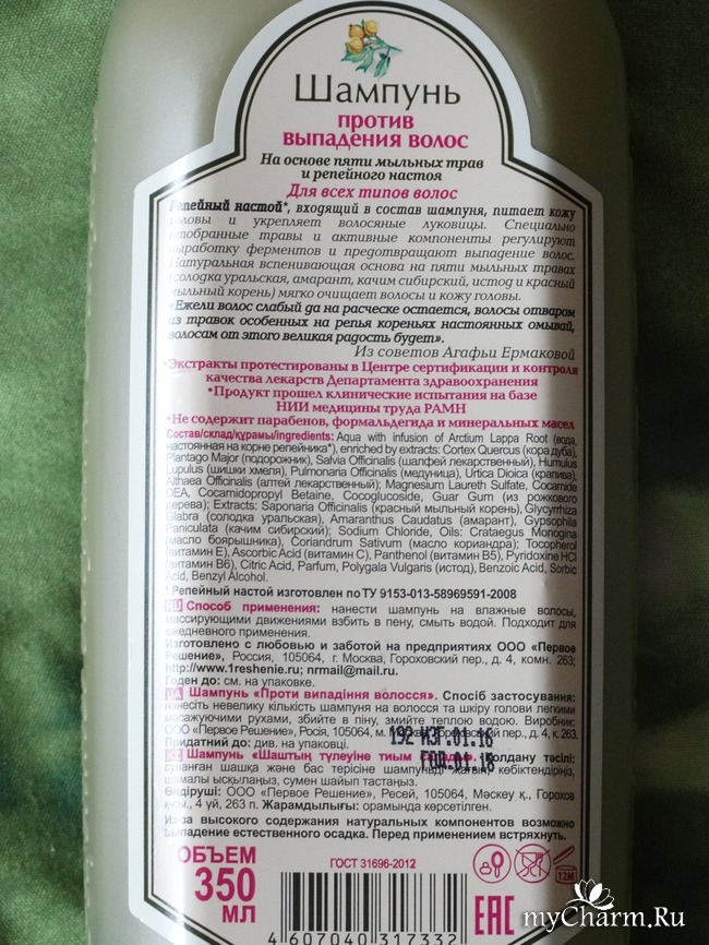 На обратной стороне флакона размещена подробная информация о составе средства, а также о том, как благотворно отдельно взятые компоненты влияют на здоровье наших волос.