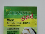 На лицевой стороне мы можем видеть наименование продукта: сверху - face organic, ниже Маска антистрессовая, релаксирующая (сбоку пометочка красными буквами "SPA" ).