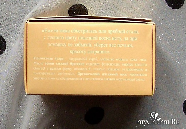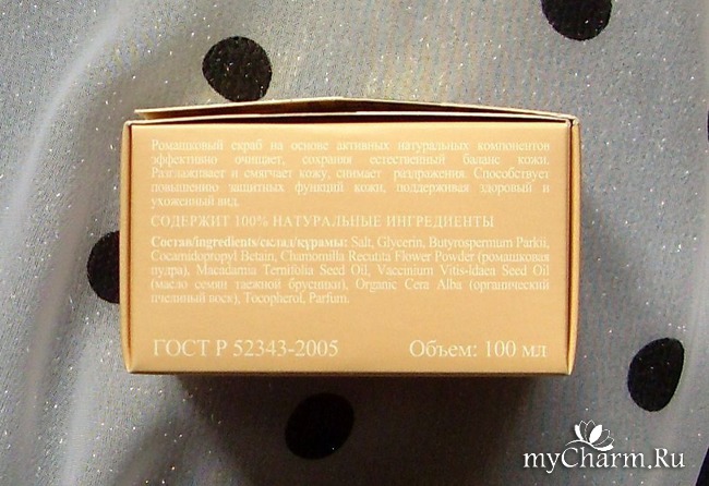 На фронтальной стороне коробочки есть указание, которое понравится любительницам всего натурального – скраб не содержит SLS и парабенов. Зато в нем присутствуют и, главное, работают, активные био-вещества: органический пчелиный воск, масло семян таежной брусники, ромашковая пудра.