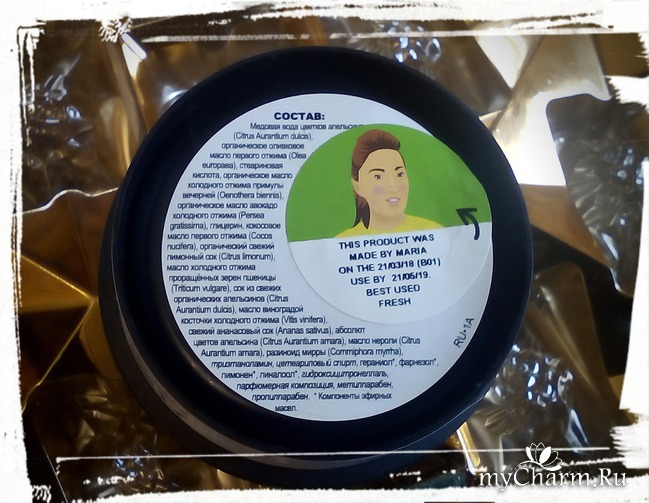 Так как продукцию LUSH изготавливают вручную, то есть у них одна "фишечка" - они печатают картинку того человека, который и приложил ручки к данной баночке. В моём случае, эту фею зовут Мария)