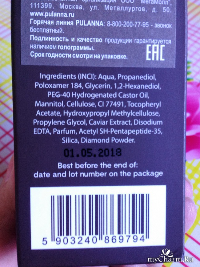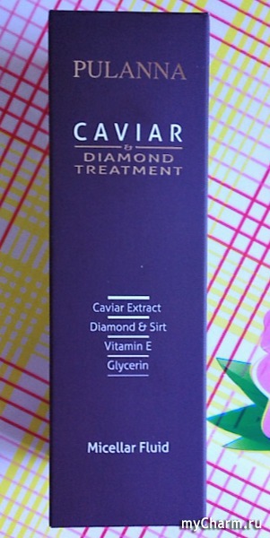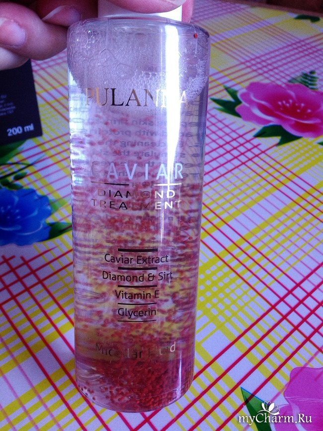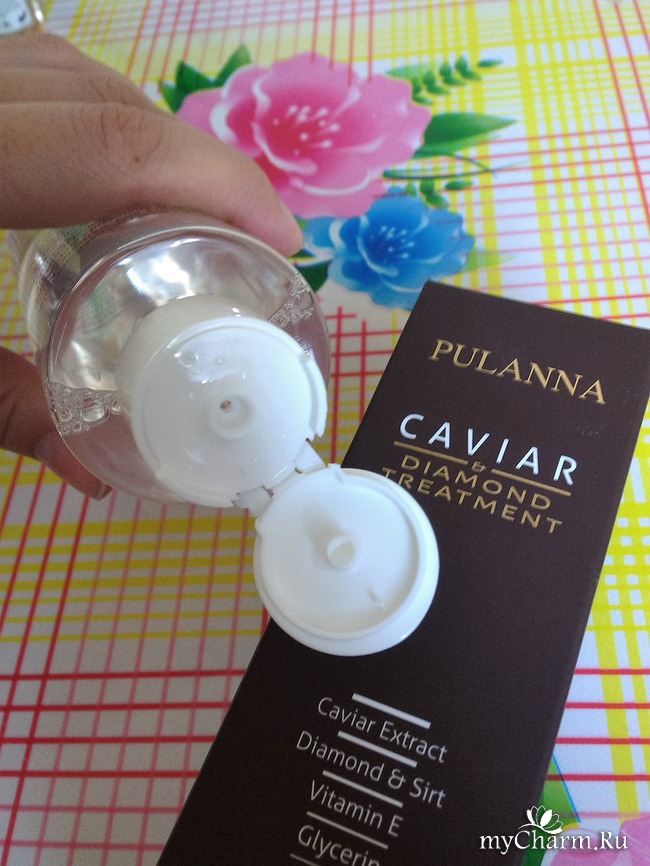 Мицеллярная вода от бренда PULANNA относится к новинке. Это новая серия косметических продуктов, в состав которых входит черная икра и бриллианты. В серию входит также лифтинг-крем для лица и сыворотка для кожи вокруг глаз. С ними я познакомлю вас чуть позже.