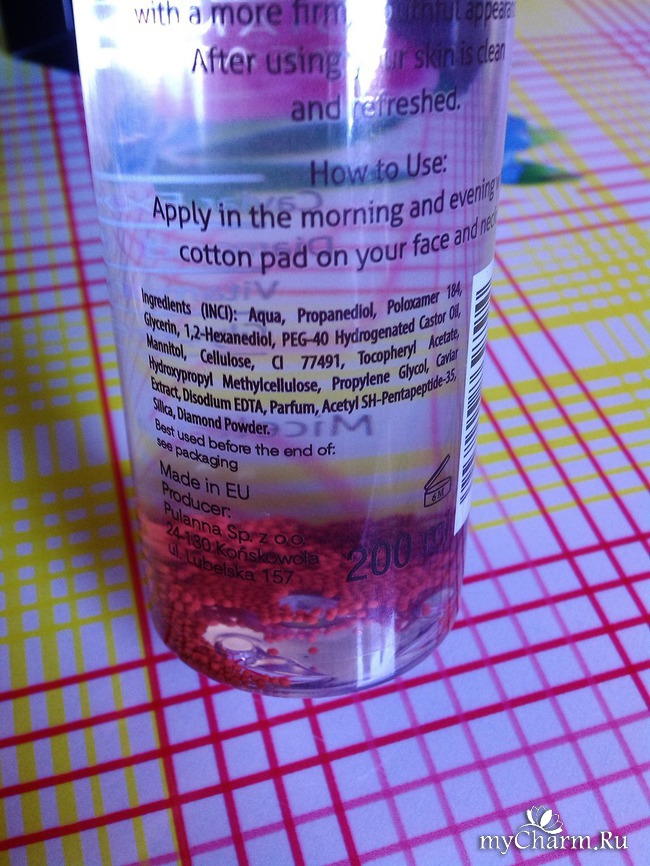 Изюминкой этого средства, помимо его полезных составляющих, стали красные шарики, имитирующие икру. Это необычно, интересно и впечатляет. Каждый раз, когда начинаю пользоваться мицелляркой, я пару минут играю с этими шариками. Переворачиваю флакон и наблюдаю, как в вихре воды кружатся икринки. Хоть их и немного в этом средстве, но они так красиво двигаются. Просто невозможно удержатся от наблюдения за ними.