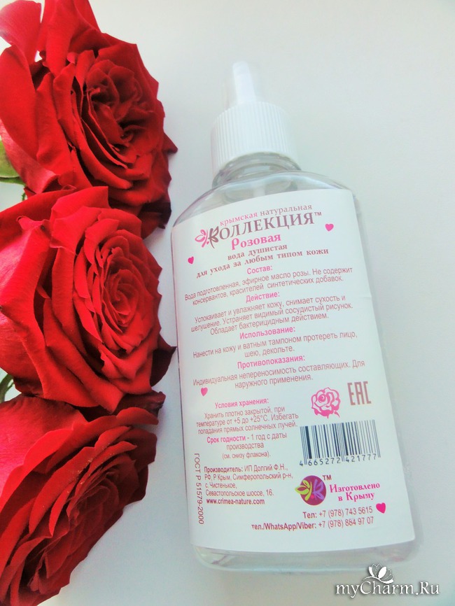 Оформление флакончика симпатичное: с лицевой стороны название средства и бренда, адрес сайта на фоне нарисованных роз, на обороте информация о составе, действии и использовании душистой водички.