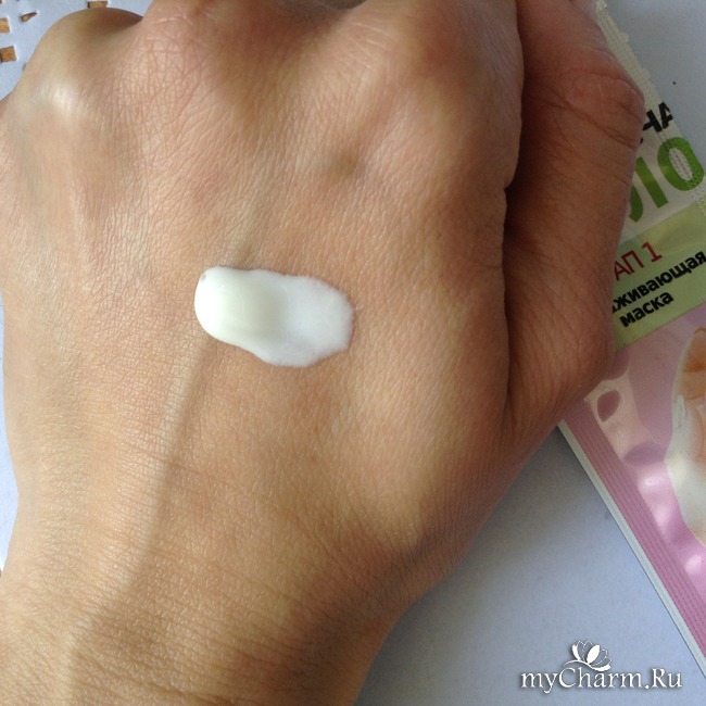 Второй этап — нанесение сыворотки. Она имеет прозрачно-белый цвет и похожий на маску запах. Хорошо наносится на кожу, излишки можно снять салфеткой.