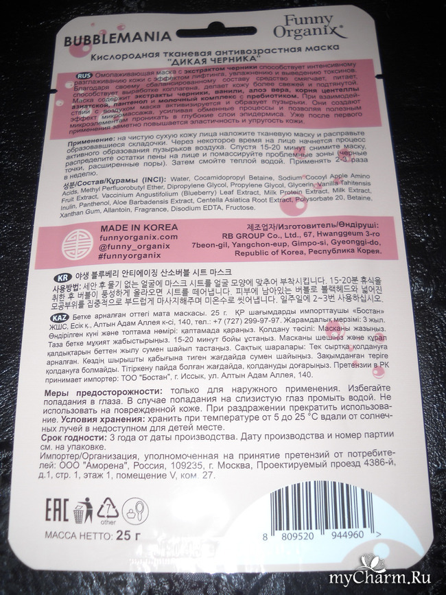 Состав у маски тоже весьма недурен – в нем содержатся молочный комплекс с пробиотиком, пантенол, аллантоин, а также экстракты корня центеллы азиатской, алоэ вера, ванили и черники. Инулин в сочетании с экстрактами корня центеллы, алоэ вера и ванили отлично питают и смягчают кожу, одновременно способствуя выработке коллагена. А присутствующий в составе пропитки экстракт черники является великолепным природным источником витаминов C и A, а также органических кислот и антиоксидантов, благодаря чему данный экстракт помогает сделать кожу более подтянутой и свежей!