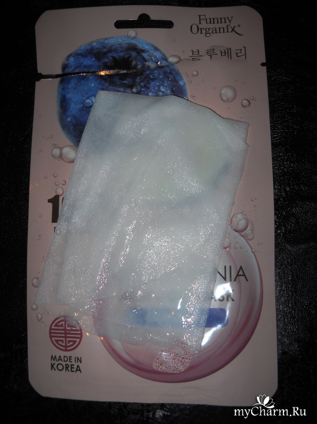 В сложенном виде масочка выглядит вот так, и на фото отлично видно, что пропитки и в самом деле очень много! А еще мне хотелось бы отдельно отметить восхитительный аромат этой маски! Его хочется вдыхать снова и снова! Это реально самый лучший аромат среди всех масок данной серии! Поначалу я думала, что лучше всего будет пахнуть клубничная масочка, но нет – в фаворитах в плане запаха у меня теперь именно черника!