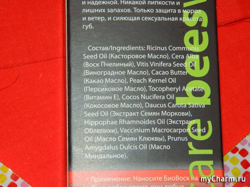 Конечно же, на упаковке указаны компоненты, входящие в состав биовоска. Они все натуральные! Это семь масел (касторовое, виноградное, какао, персиковое, кокосовое, миндальное и семян клюквы) и два экстракта (семян моркови и облепихи). А ещё – пчелиный воск и витамин Е.