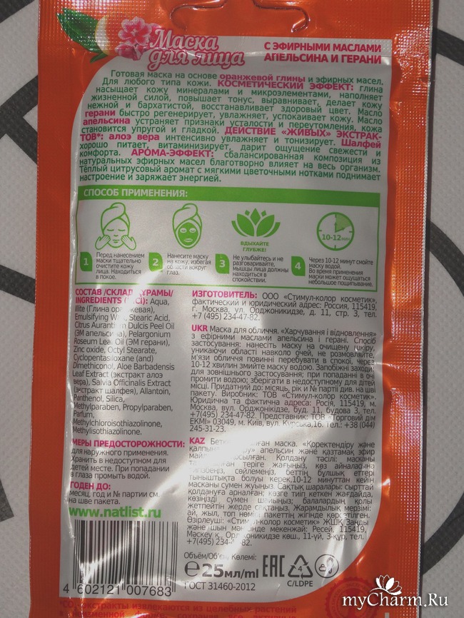 Что касается состава данного продукта, то он во многом не может не радовать! Помимо уже упоминавшихся эфирных масел апельсина и герани, маска содержит чудесные экстракты таких растений, как алоэ вера и шалфей. И то и другое прекрасно влияет на состояние кожи, оказывает благотворное воздействие на неё. Так что даже некоторое содержание парабенов не пугает - пользы от этого средства гораздо больше!