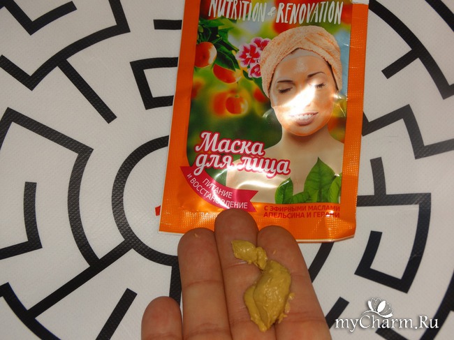 Маска, что ожидаемо, имеет оранжево-желтый оттенок. Её консистенция в меру густая. В любом случае, держать в руках сей продукт весьма приятно.