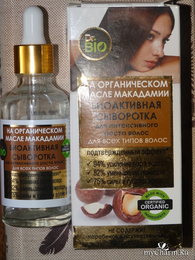 Здесь же мы можем прочесть, что данная сыворотка - на органическом масле макадамии.