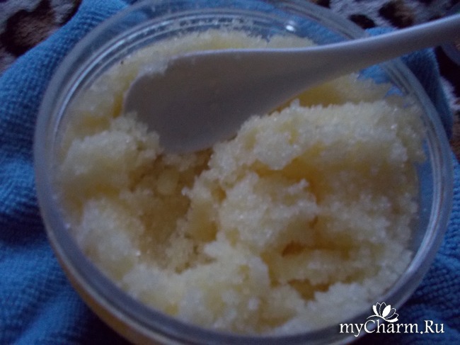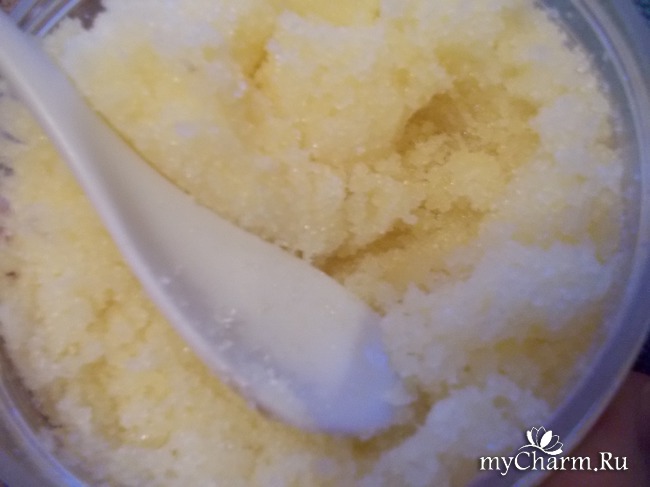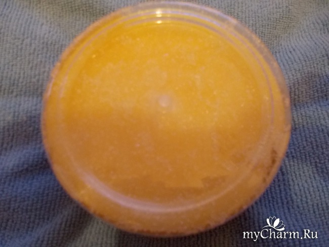 Сам скраб светлого жёлтого цвета с тонким сладко-кислым ароматом.