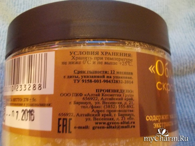 Произведено в городе Барнауле ООО ПКФ "Алтай Косметик Груп". Скраб хранится при температуре от нуля до двадцати пяти градусов тепла.
