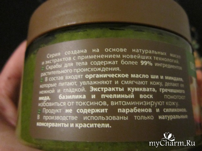 Замечательный аромат, средство остается на коже, при растирание не летит в разные стороны. Удаляет мёртвые клетки, улучшает текстуру, обновляет и кожа дышит. Придает упругость, выравнивает, прекрасно увлажняет, глубоко очищает.
