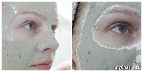 Наношу на предварительно очищенную кожу довольно плотным и ровным слоем, избегая области кожи вокруг глаз. Косметическим шпателем мне неудобно пользоваться, специальной кисточкой пока так и не обзавелась, поэтому наношу руками, получается очень даже хорошо.