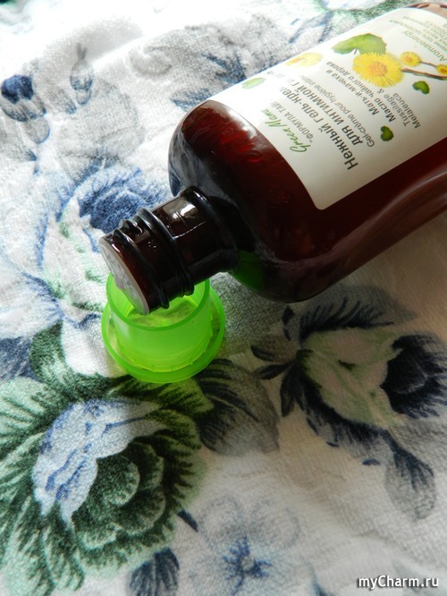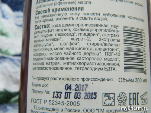 Остановлюсь коротко на составе: основная часть ингредиентов – растительного происхождения. Кроме заявленной мать-и-мачехи и масла чайного дерева, здесь ещё есть экстракты календулы и шалфея. Но присутствует здесь также и лауретсульфат натрия, то бишь, SLES и какой-то консервант, который почему-то остался безымянным…