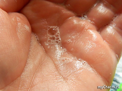 Пенится средство достаточно хорошо. Пена нежная и ароматная, деликатно очищает и дарит ощущение свежести, смывается легко. На одну процедуру средства нужно совсем немного – расходуется оно весьма экономно, так что флакона объёмом 300 миллилитров хватит надолго.