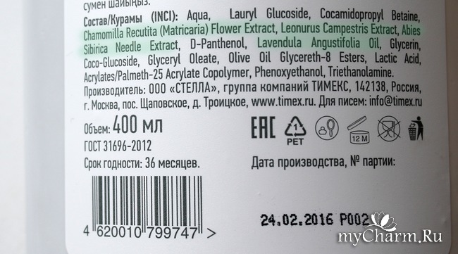 Тут же мы видим, что производитель - Москва, объем - внушительные 400 мл! Правда, меня немного смутило, что срок годности после вскрытия - 12 месяцев. Обычно, "хорошие" составы имеют более короткий срок...