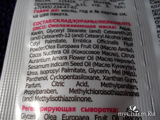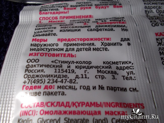 Пакетик-саше состоит из двух частей, которые легко можно разделить, отсоединив друг от друга. Изготовитель: ООО "Стимул-колор Косметик". Объёмы и маски, и сыворотки по шесть миллилитров. Этого нектара жизни хватает на несколько приёмов. Всё зависит, как щедро вы нанесёте на себя эликсир молодости.