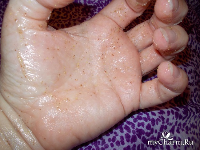 Консистенция приятная, ароматная, хорошо наносится и мягко, но действенно скрабирует кожу рук. Я с мужем получила огромное удовольствие от процедуры.