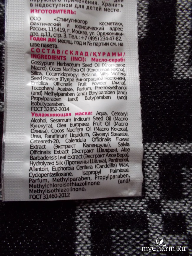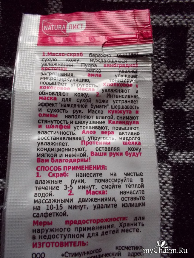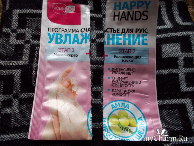 Программа Счастье для рук включает в себя Увлажнение 1 этап: скраб-масло и 2 этап: увлажняющая маска. Объём косметических средств по шесть миллилитров. Части пакетика разделены между собой спайкой.