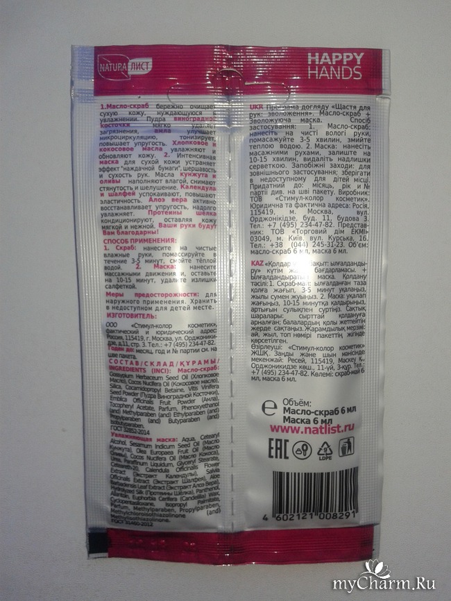 Данный продукт сочетает в себе сразу 2 средства: масло-скраб и увлажняющую маску, которые легко отделяются по пунктиру. То есть увлажняющий эффект будет происходить поэтапно: сначала мы будем скрабировать ручки, а затем использовать ухаживающую маску. Кстати, более подробную информацию про "Увлажнение" от Naturalist можно прочитать на обратной стороне пакетика.