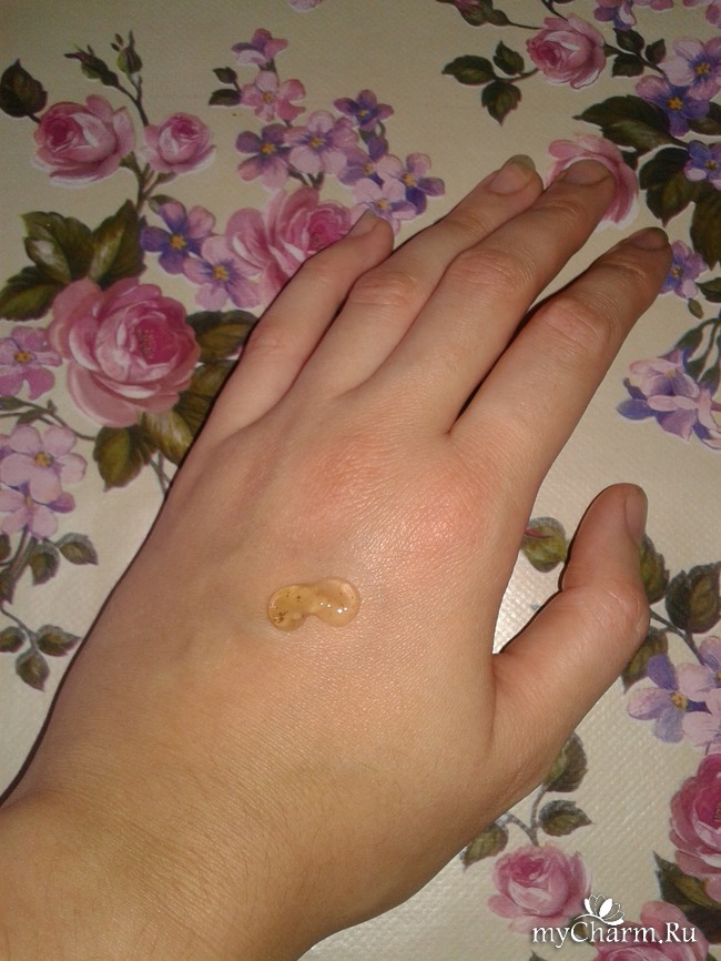 При выдавливании скраба из пакетика, кажется что он густоват и имеет маслянистую консистенцию. По цвету масло-скраб желтый, и напоминает мед. Аромат у него приятный, сладенький. Скрабирующие частички мелкие, коричневого цвета - видимо это и есть пудра виноградной косточки. Однако при соприкосновении с влажной кожей, масло-скраб становится кремообразным и белым, действует он очень мягко и нежно, бережно очищает и обновляет кожу.