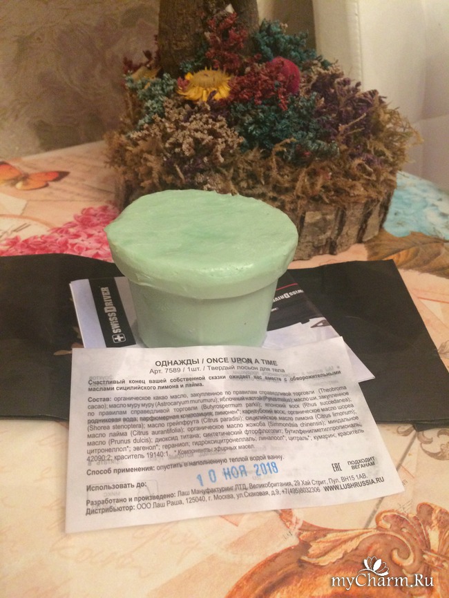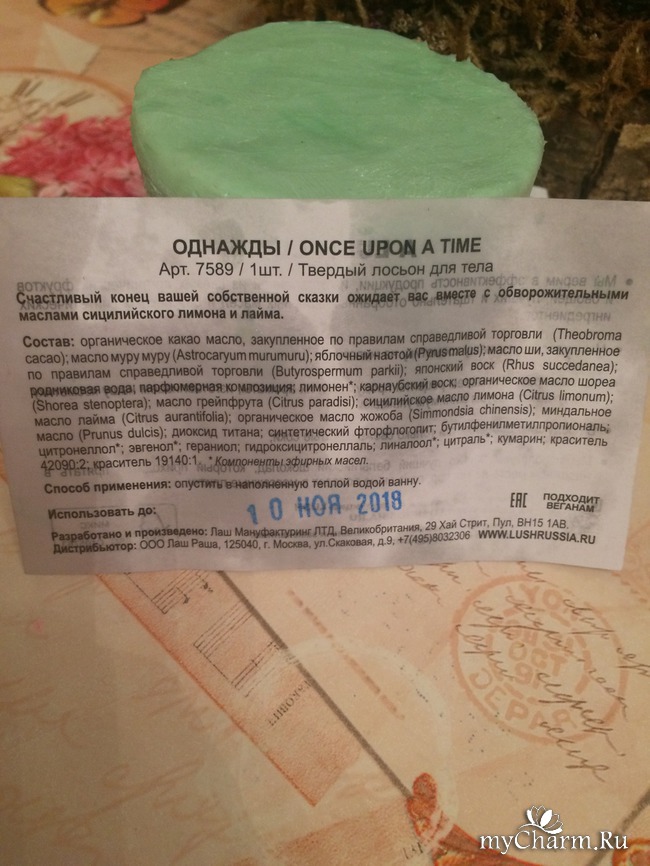 Аромат просто необыкновенный. Настолько он яркий, что я его почувствовала даже через пакет. А когда ехала домой, то в машине остался этот приятный аромат. Кстати сам лосьон имеет такое философское название "Однажды". Во время ванных процедур или после, с этим средством однозначно можно погрузиться в свои мечты. Какой вес плитки с лосьоном я не знаю, но он расходуется совершенно по-разному, если средством пользоваться после душа или погружать в ванну с теплой водой.