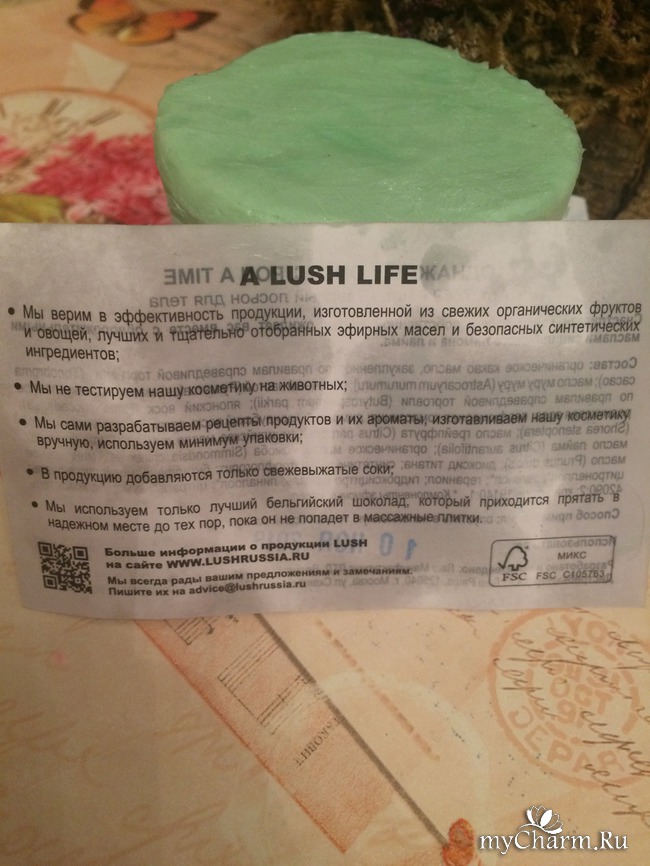 О самом производителе я уже не раз упоминала, поэтому сразу перейдем к рассмотрению нашего лосьона. Так как средство не имеет определенной упаковки (как и многие продукты данного бренда), достался он мне вот в таком фирменном пакетике черного цвета, на котором нарисованы животные. Надпись на упаковке указывает, что компания не тестирует свою продукцию на животных. Я думаю многие успели уже это запомнить. Достаем наш продукт из пакета. Как понятно из названия, лосьон для тела имеет твердый вид. Цвет плитки имеет приятный мятный оттенок.