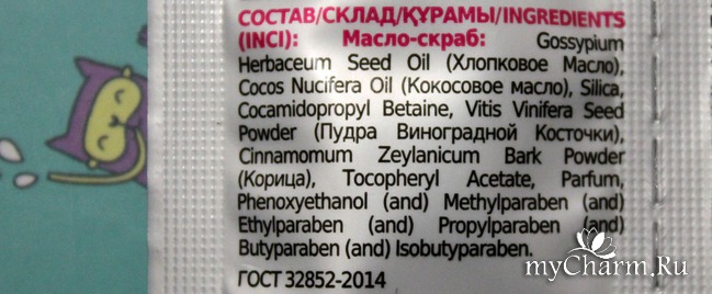 Очень удобно, что производитель расшифровывает в скобках как раз те составляющие, на которые стоит обратить внимание. Как мы видим, в составе скраба содержатся хлопковое и кокосовое масла, а в роли шлифующих частичек выступают пудра виноградной косточки и корица.