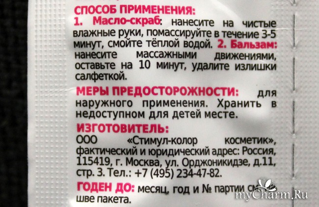 Сама консистенция мне нравится. Скрабирующие частицы оптимальны и по размеру, и по жесткости для ухода за руками, я считаю. Однако, так как это масло-скраб, смыть его сложновато. И даже после большого количества воды на руках остается словно маслянистая пленочка (знаю, что кому-то это принципиально не нравится, поэтому я считаю, что обязана об этом предупредить). После двух применений я уже поняла, что даже не стоит пытаться смыть всё полностью, поскольку после промакивания рук полотенцем, ничего такого больше не ощущается. Зато сразу кожа становится более мягкая!