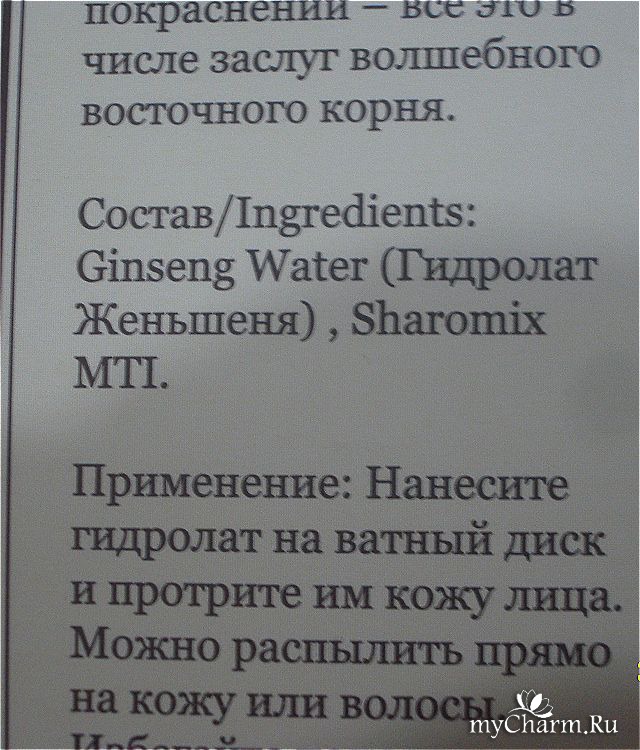 Наношу, как написано на упаковке, средство с помощью распыления на чистый ватный диск. Кстати, у Гидролата Женьшеня очень приятный, слегка сладковатый запах. Мне он по крайней мере нравится.