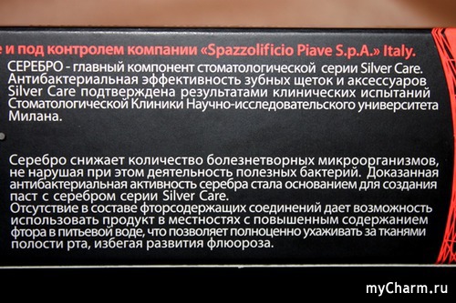 Паста не содержит фтора, что является плюсом для многих потребителей. Также в ней нет натрия лаурилсульфата. Производится линейка средств данного бренда в г. Дмитров, а качество контролируется компанией «Spazzolificio Piave S.p.A.» Италия.