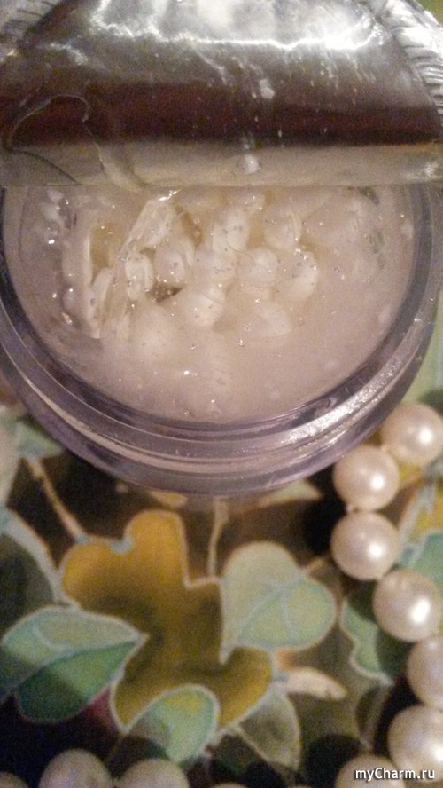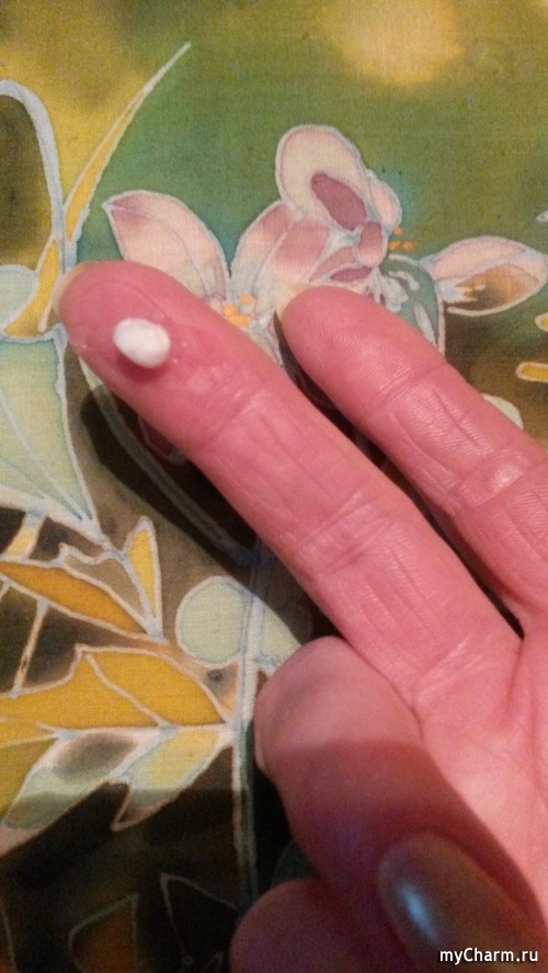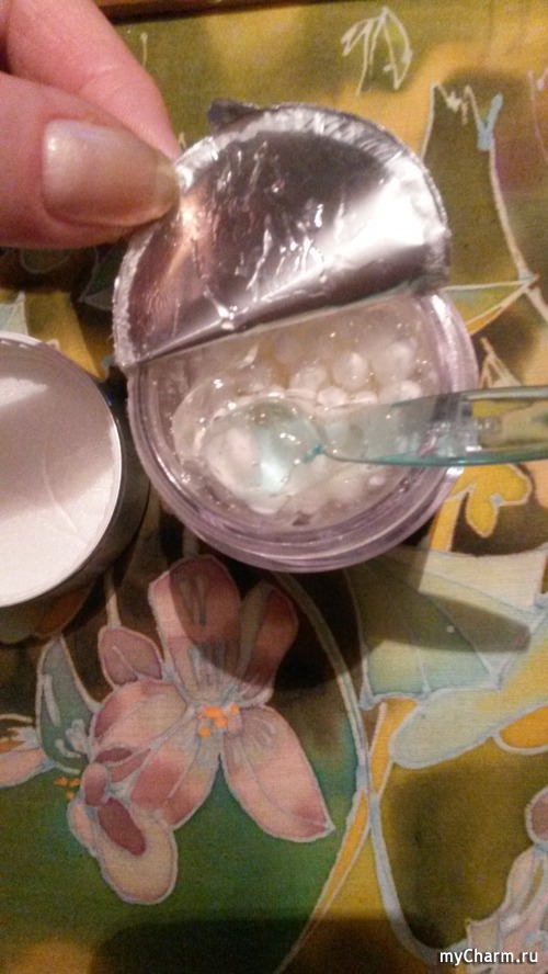 Крем заявлен как дневной. Лопаточка-ложечка пригодилась, из баночки достаю одну горошину в собственном соку - маленький, белый шарик крема. Как умудрились так все завернуть и упаковать - умом не понять, но каждая горошина - это кусочек крема с ионами серебра.