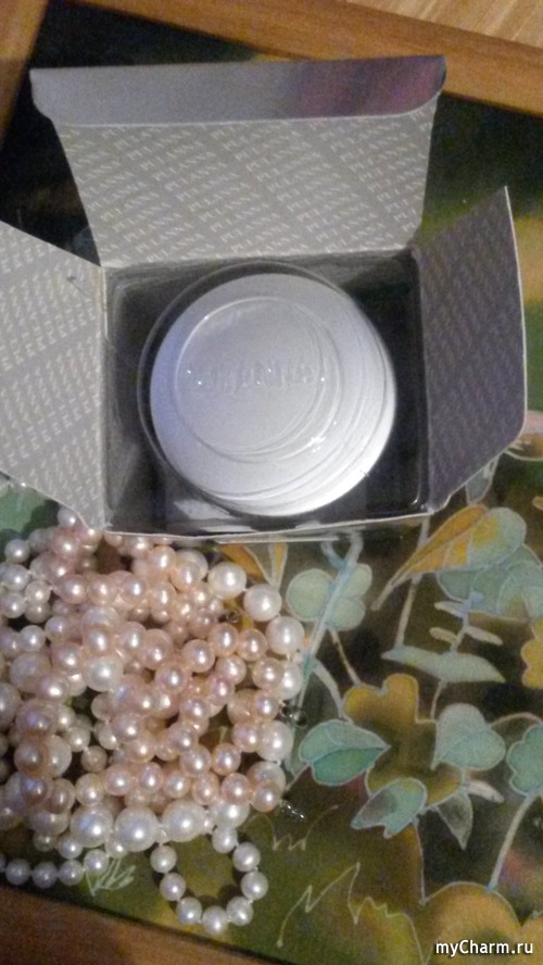 Крем упакован в симпатичную картонную коробочку серебристого цвета с голубой каймой. А коробочка не простая, с прозрачным окошком. Из симпатичного окошечка выглядывает баночка с удивительным наполнением - круглыми шариками белого цвета в блестках серебра. Открываем коробочку, сверху упаковка зафиксирована прозрачным пластиковым вкладышем с фирменным логотипом, внизу такой же вкладыш-держатель, но больший по размеру, из матового пластика, на нем тоже отпечатан логотип фирмы PULANNA.