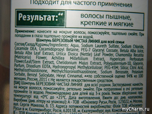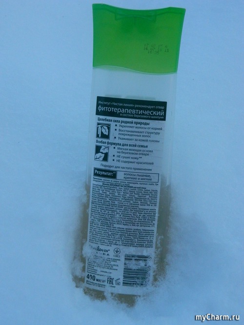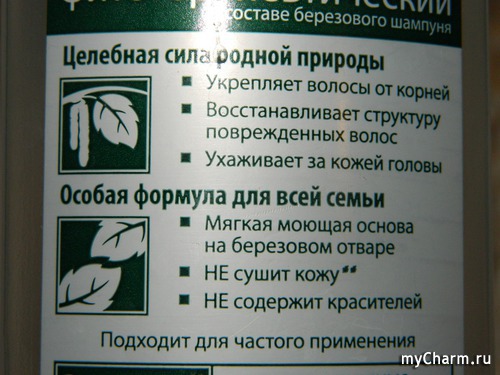 Шампунь бесцветный, прозрачный с приятным ароматом растений, среди которых слышится запах берёзовых листьев. Не густой, но и не совсем жидкий – консистенция как раз для шампуня. По мокрым волосам распределяется легко, мылится хорошо.