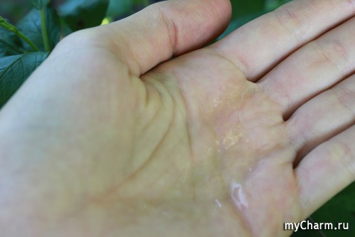 Шампунь средней консистенции - не густой, но и не жидкий, поэтому, когда наливаю его в ладонь, не начинает мгновенно растекаться.