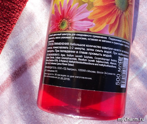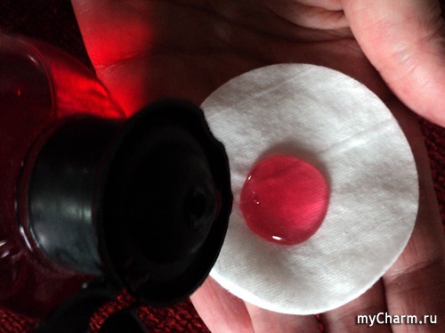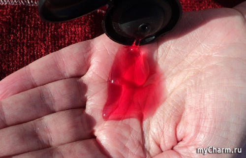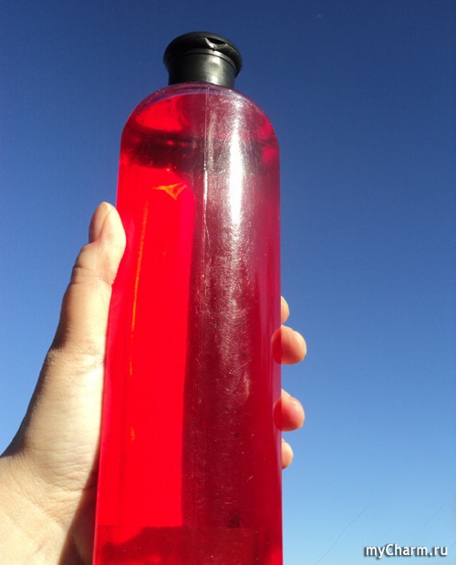 Не удержалась, сфотографировала на фоне ясного неба. На просвет это смотрится круто! Такой красный и прозрачный состав. Как будто гранатовый сок или чай каркаде.Конечно, интересно, как получился такой интенсивный и яркий цвет. Искусственных или пищевых красителей, судя по информации на этикетке, в составе нет. Неужели это так сильно окрашивает вот этот цветочный экстракт (он в конце списка ингредиентов) – Centaurea Cyanus Flower Extract? А ведь это экстракт василька. Знаю, что васильки бывают розовые, но не красные же! А на упаковке, кстати, изображены, скорее календулы. В общем, вопрос про цвет остается открытым.